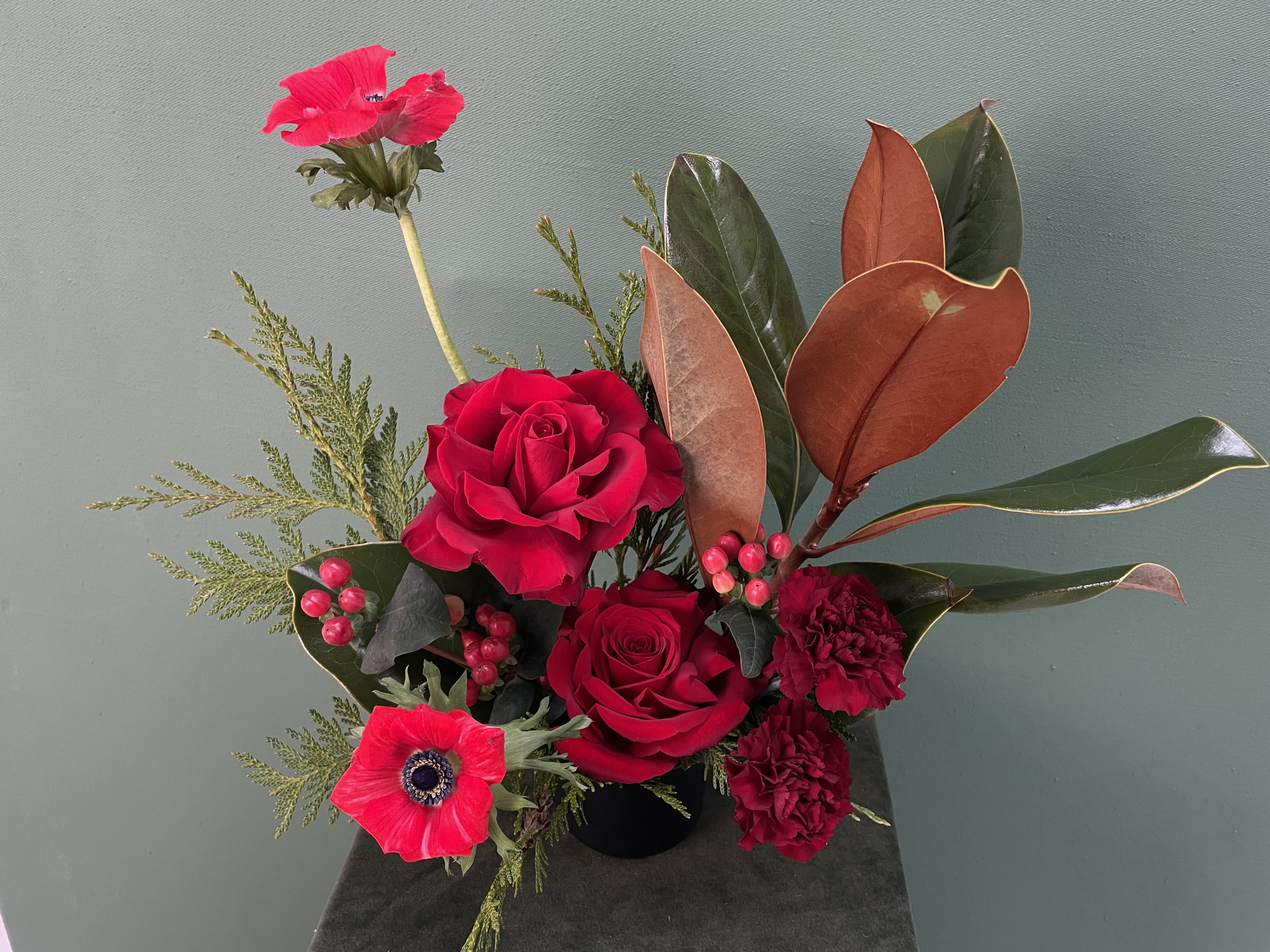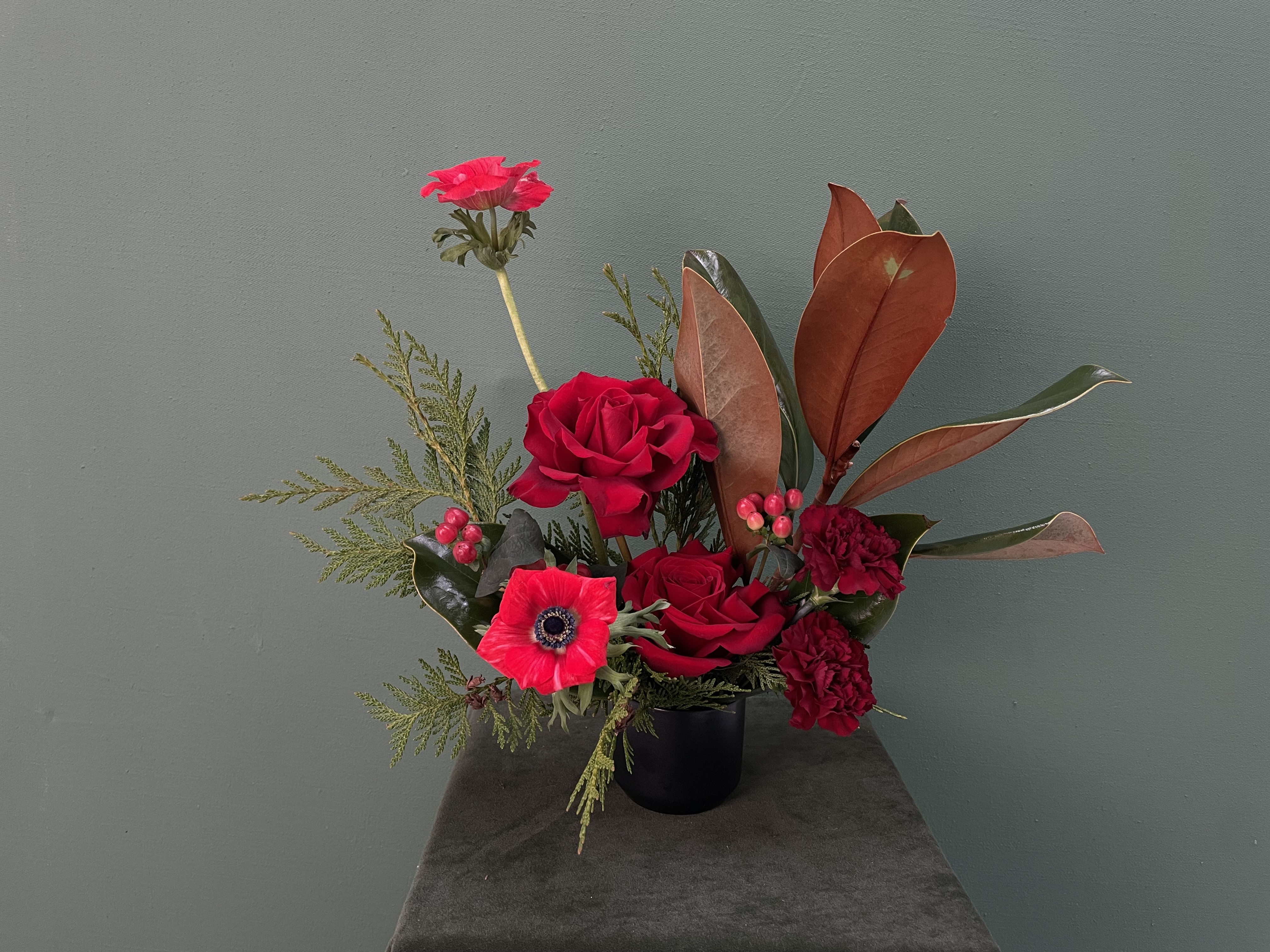 Fresh winter greenery adds fragrance and texture, while the bold red palette delivers that unmistakable holiday warmth. Ideal for desks, side tables, hostess gifts, or adding a pop of festive colour to your home, Holiday Spark proves that even a small arrangement can make a big seasonal impact.