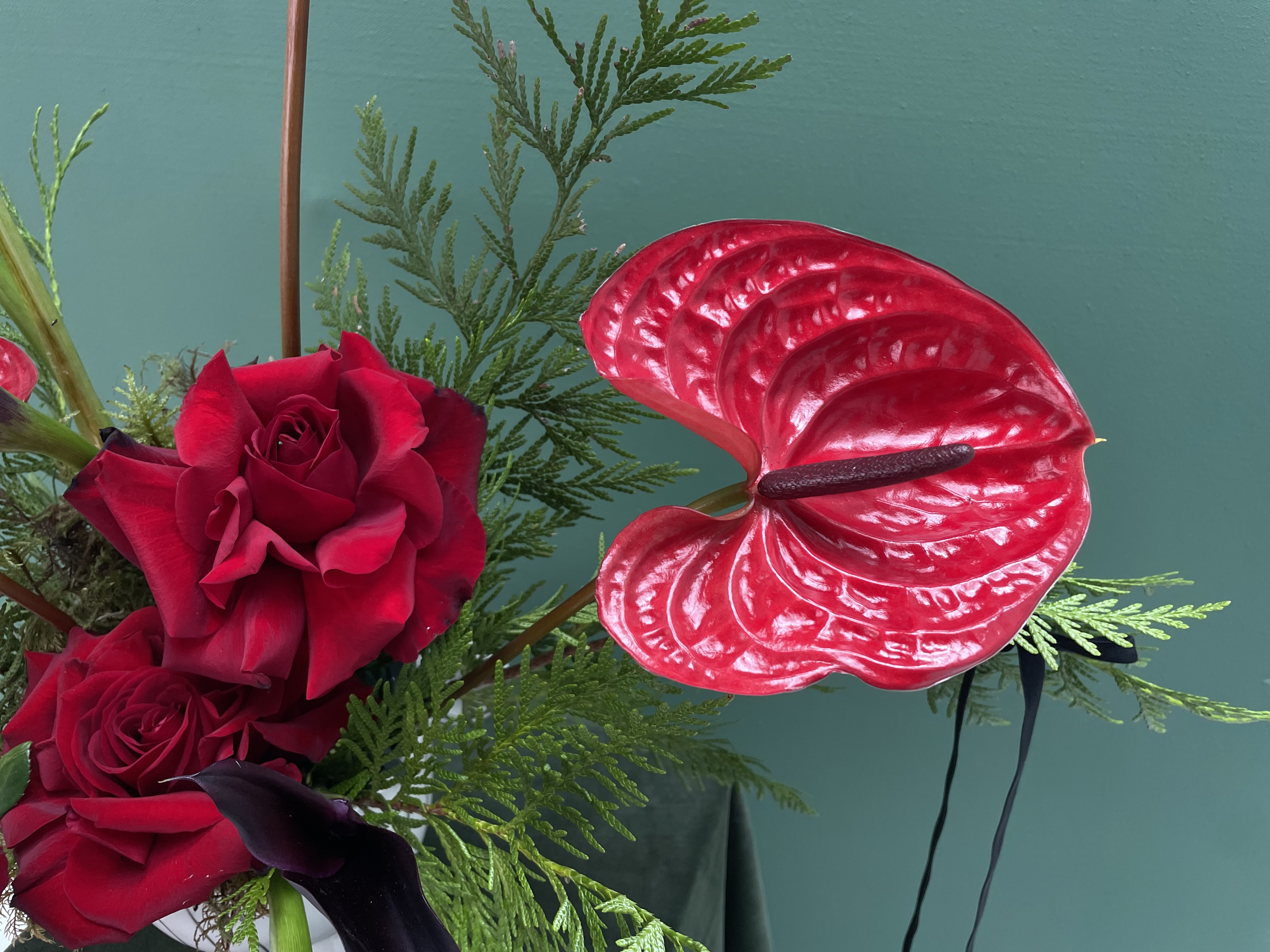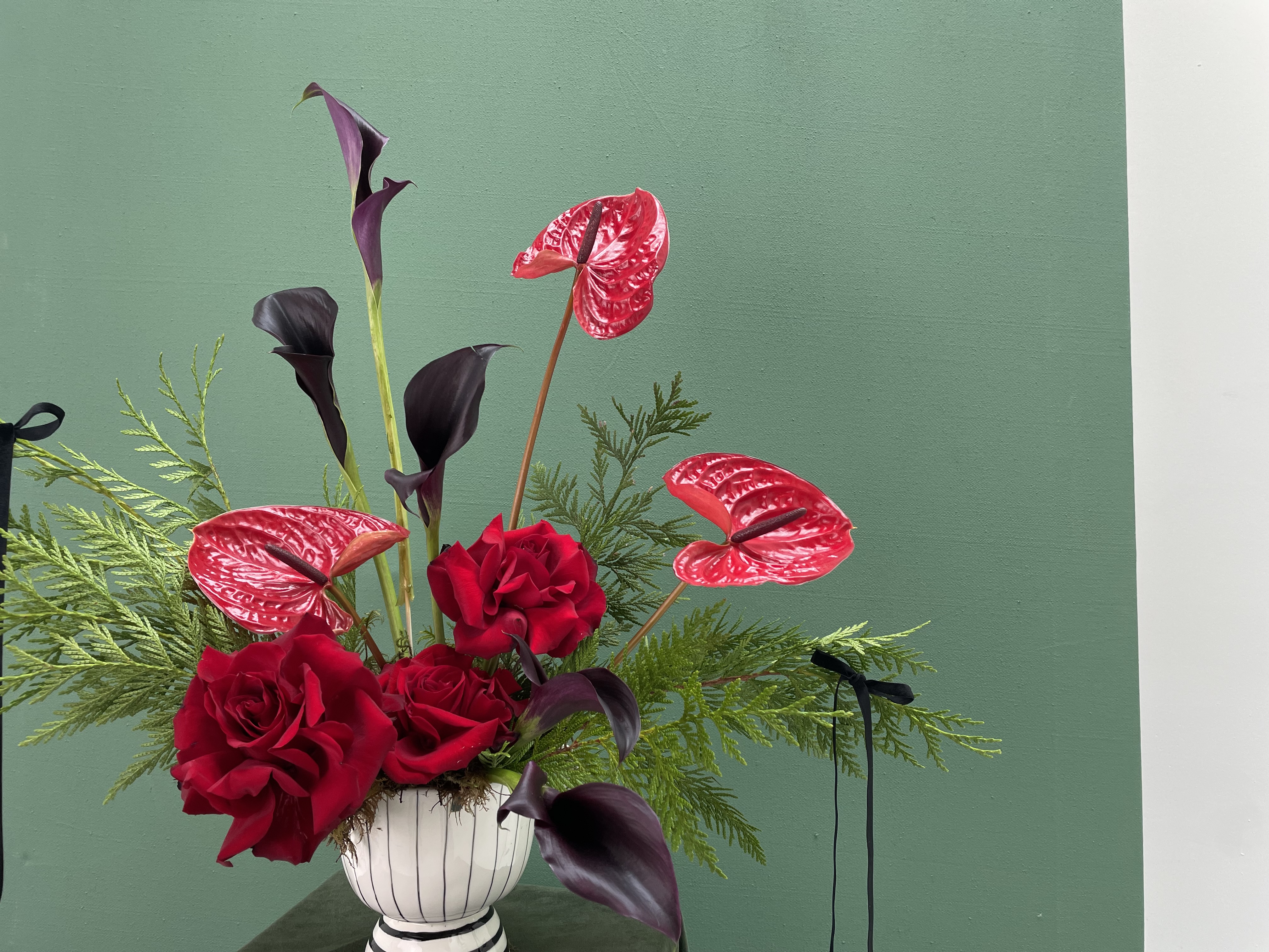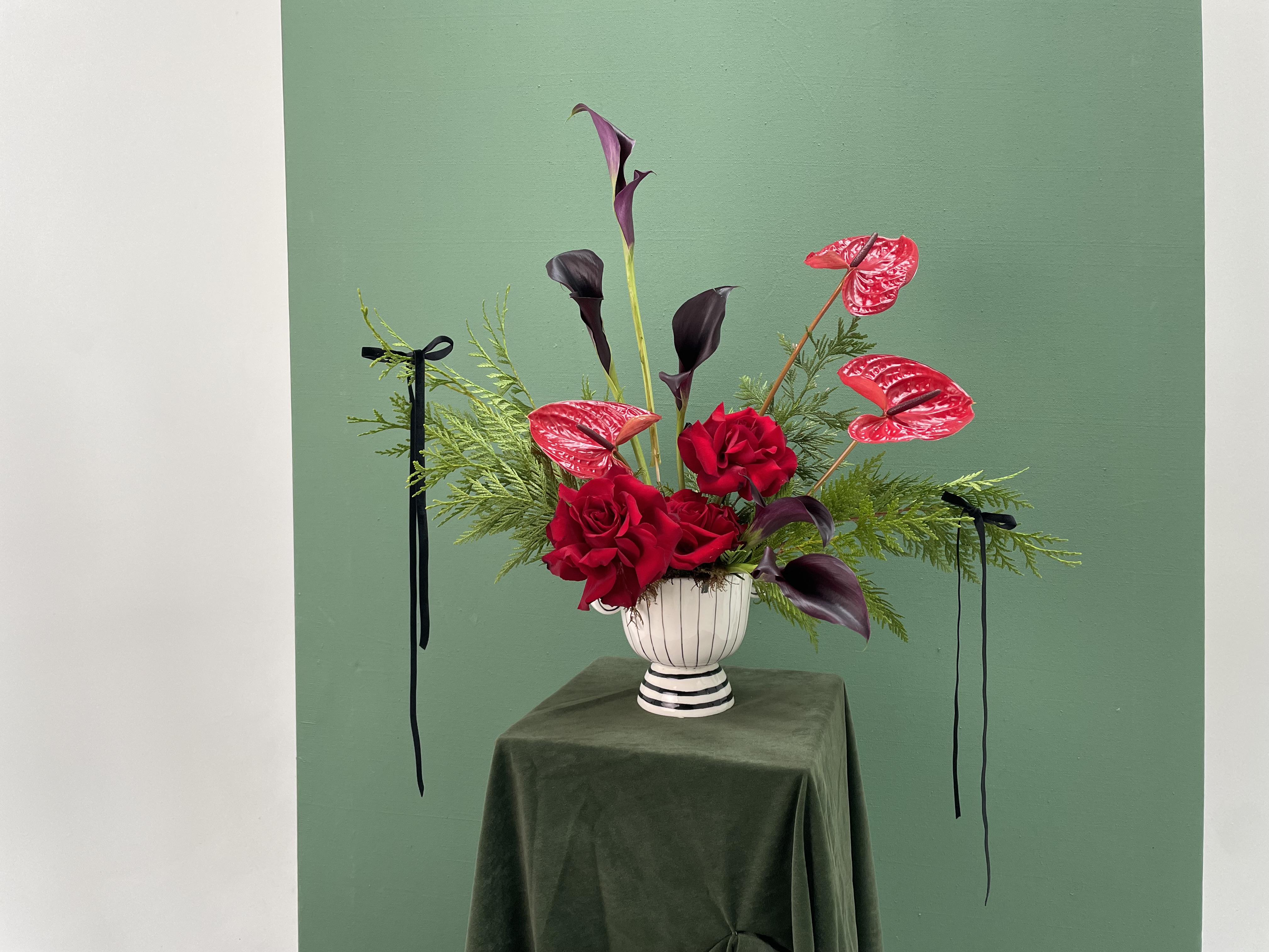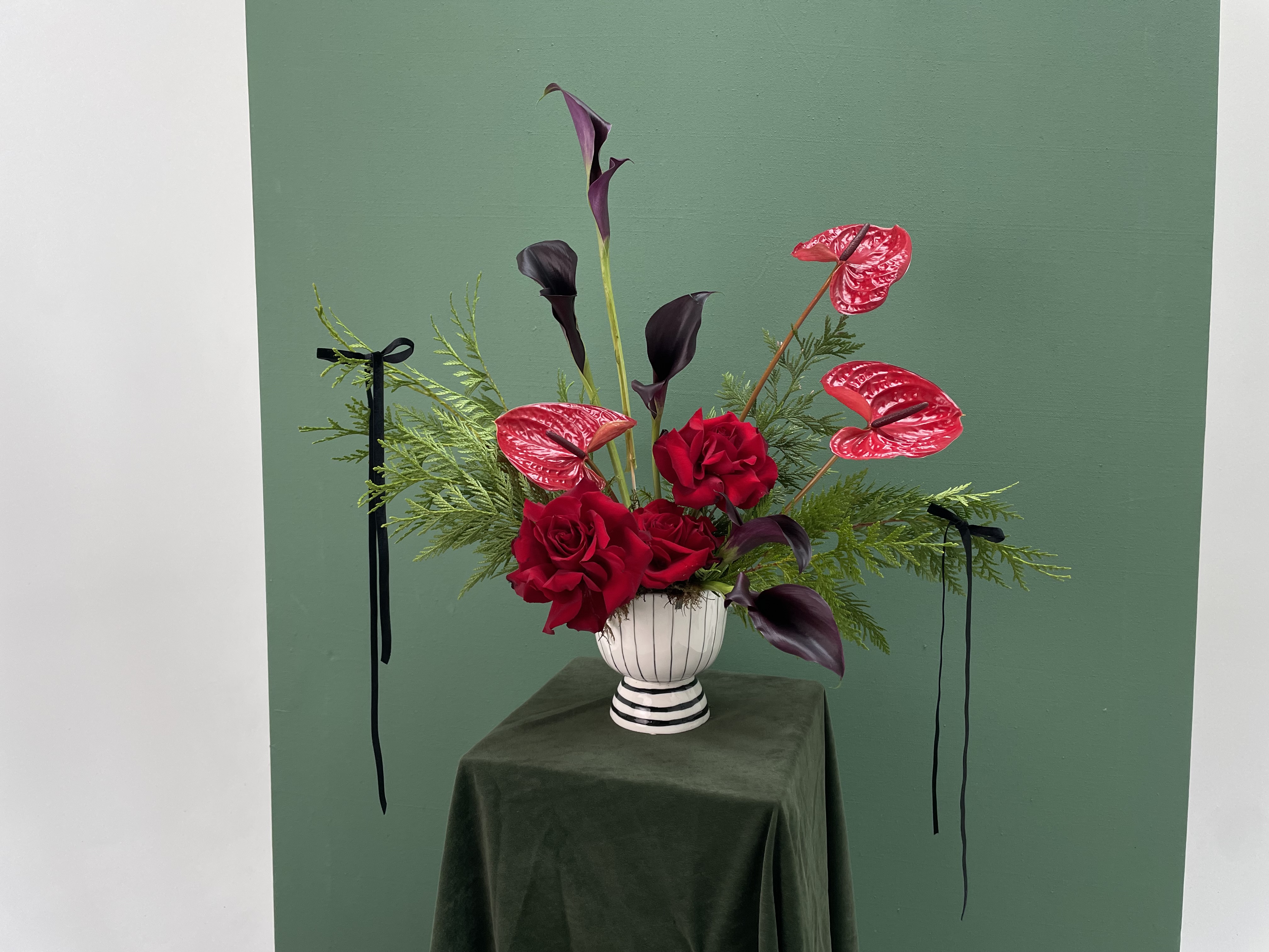 Celebrate the season with bold, modern holiday flair. Velvet Sleigh pairs sleek black calla lilies with radiant red anthuriums, nestled among festive greenery in a striking black-and-white ceramic vessel with elegant handles. Finished with soft black velvet bows, this long-lasting arrangement evolves as the blooms open, creating a living centerpiece that’s both playful and artful. A festive statement piece that brings holiday magic to any space.